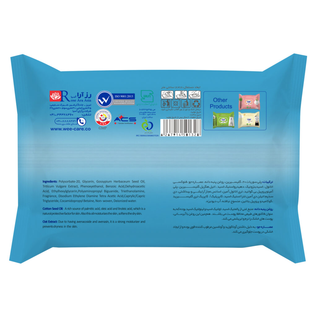 نوع محصولدستمال مرطوب کودک پاکتی درب‌دار حاوی جو و روغن پنبه‌دانه