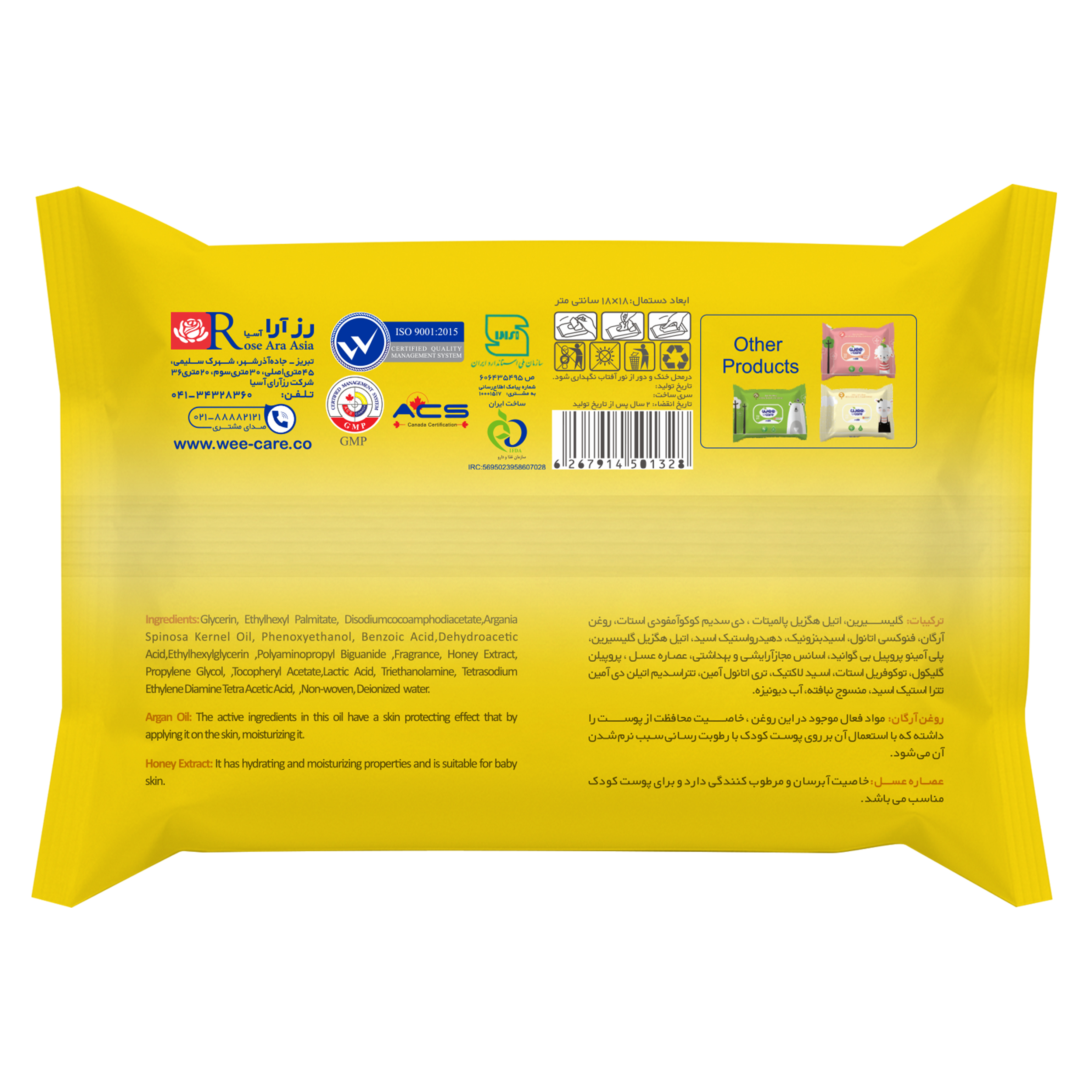 | نوع محصول | دستمال مرطوب کودک پاکتی دربدار حاوی عسل و روغن آرگان |