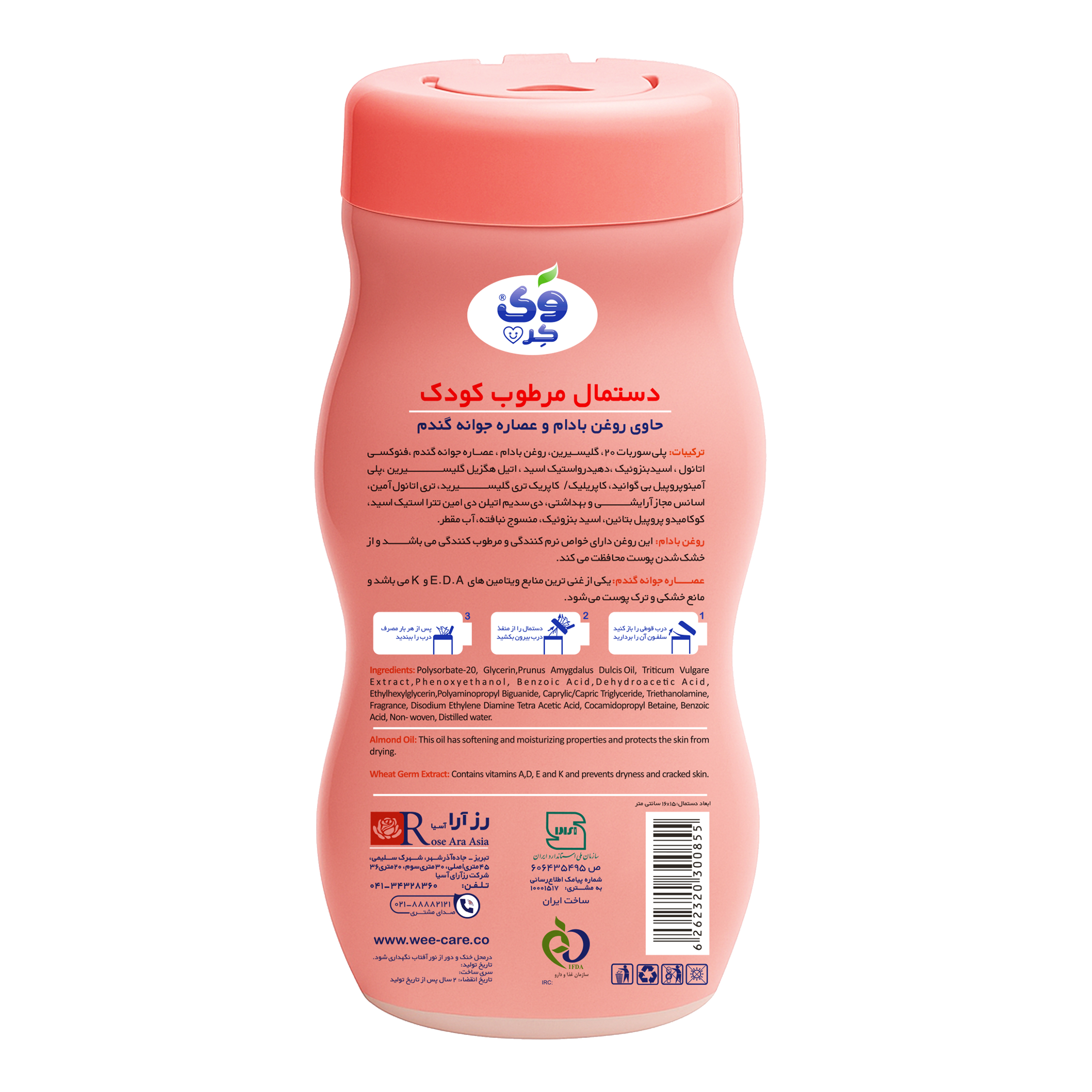پوست نوزادان حساس و لطیف است و نیاز به مراقبتی ویژه دارد. دستمال مرطوب کودک وی کر حاوی عصاره جوانه گندم و روغن بادام با فرمولاسیونی غنی از ویتامینها و مواد معدنی، علاوه بر پاکیزگی ملایم، نرمی و لطافتی ماندگار به پوست کودک میبخشد.